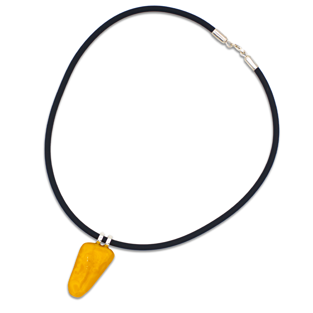 Der Choker mit Anhänger aus echtem baltischem Naturbernstein in goldoranger Tönung ist ein stilvolles Statement für alle, die Design mit besonderem Material schätzen. Das schwarze Naturkautschukband und der hochwertige 925er Sterlingsilber-Verschluss runden das moderne Erscheinungsbild perfekt ab.